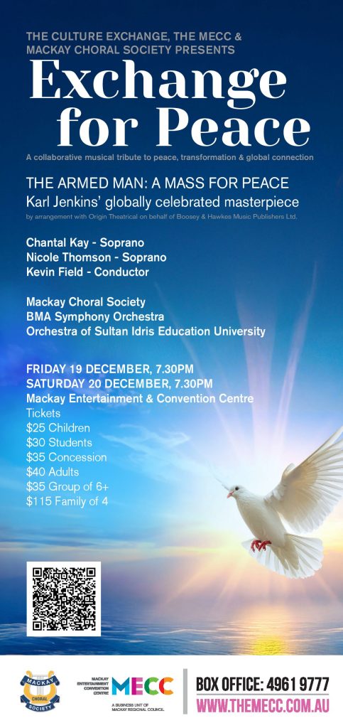 An extraordinary international collaboration between Mackay Choral Society and Bentley Music Academy, Exchange for Peace brings together Australian and Malaysian orchestral musicians, adult choirs, and children’s voices under the baton of renowned conductor Kevin Field.